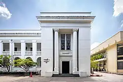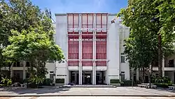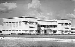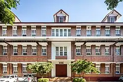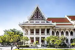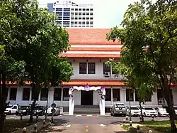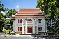 The college's administration had laid out a plan for its physical development in 1913, with the eastern side dedicated to academic and administration buildings, and the western side used for agricultural research.[1] The first permanent structure, the Administration Building, was constructed from 1915 to 1921, and became the university's main building. It was followed by the Science Building in 1929 and Chakrabongse Building (hosting the student clubs) in 1933. These early structures, along with the Auditorium (1939), incorporated Thai-style elements with modern construction methods, in contrast to the increasing adoption of modernist architecture following the abolition of absolute monarchy in 1932, influences of which are seen in the Engineering and Physics buildings (1935), Matthayom Horwang School (1936), Chemistry Building (1940), and the Architecture, Dentistry and Pharmaceutical buildings (1941). The majority of these early buildings saw design contributions by Phra Sarotrattananimman, one of the first formally trained Thai architects.[2]