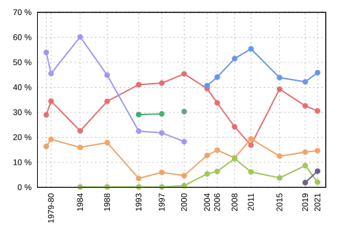 | Election | Liberal | Conservative | New Democratic | Green | People's | PC | Reform / Alliance |