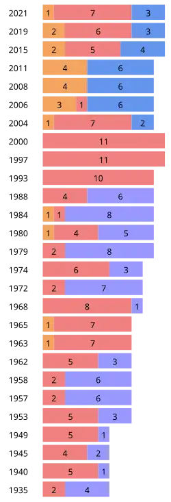 This is arguably the most competitive region in Ontario and one of the most competitive in all of Canada, as all three major parties have significant strength. Traditionally a conservative-leaning area outside of Hamilton and Welland, the Conservatives won the majority of seats in the 1970s and 1980s, aside from 1974 when the Liberals did well, taking six of nine. Before that the Liberals had dominated the area in the 1960s and from 1940 to 1953 with the Conservatives dominating in the two late 1950s elections and in the 1920s and 1930s.