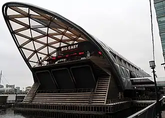 Canary Wharf is an Elizabeth line station in Canary Wharf on the Isle of Dogs in east London, England. The station forms an artificial island in the West India Docks (North Dock). The five upper levels of the station are a mixed-use development known as Crossrail Place.[3] It is on the Abbey Wood branch of the Elizabeth line between Whitechapel and Custom House. Construction began in May 2009, and the station opened on 24 May 2022 when the section between Paddington and Abbey Wood stations began services.[4][5] During the project's development the station was named Isle of Dogs, before the current name was adopted.[6] The station was developed under a fixed price contract of £500 million with £350 million provided from the Crossrail budget and £150 million from the Canary Wharf Group[7][8] with Crossrail spending an additional £80 million on safety improvements before it was opened.[9]
