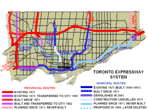 The cancelled expressways in Toronto were a planned series of municipal expressways in Toronto, Ontario, Canada that were only partially built or cancelled due to public opposition. Metropolitan Toronto's system of superhighways or freeways were intended to spur or handle growth in the suburbs while also connecting to the downtown core, in conjunction with the province's developing 400-Series Highways which would connect to municipalities outside of Metro. However these expressways were opposed by citizens within the city of Toronto downtown core, citing the demolition of homes and park lands, air pollution, noise and the high cost of construction. The Spadina Expressway, planned since the 1940s, was cancelled in 1971 after being only partially constructed. After the Spadina cancellation, other expressway plans, intended to create a 'ring' around the central core, were abandoned.