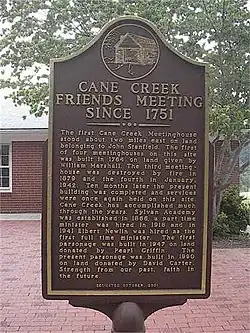 The Cane Creek Friends Meeting, founded in 1751,[2] is considered the first established Quaker community in the Piedmont region of North Carolina. The site was occupied by British troops during the American Revolutionary War.