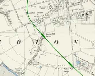 The station was to have been built on the W&SR's planned surface railway line in Surrey (now south-west London) from Wimbledon to Sutton.[1] The station was to be built on a bridge where the railway crosses Cannon Hill Lane.[2] The construction of the railway was approved in 1910.[3] In 1911 the UERL agreed to provide funding for the line's construction and to operate its train services by extending the UERL's District Railway (DR) from Wimbledon station.[4]