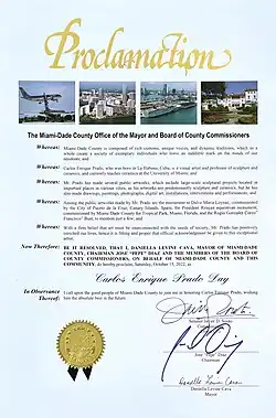 In 2022, Carlos' work was celebrated with an official proclamation from the Mayor of Miami-Dade County and the Board of County Commissioners, declaring the "Carlos Enrique Prado Day." This recognition highlighted his outstanding public art projects and their impact on the community. The same year, he received the Recognition Award at the Biennial of Cuban Contemporary Ceramics hosted by the Museum of Cuban Contemporary Ceramics, reinforcing his influence in the ceramic arts.