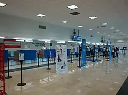 The passenger terminal is a two-story building with a total area of 12,769 square metres (137,440 sq ft). The lower level houses the check-in area, an arrivals hall with two baggage claim carousels, immigration and customs facilities, car rental services, taxi stands, snack bars, a souvenir shop, and a restaurant. The upper floor hosts the security zone and the departure concourse with a commercial area, restaurants, bars, a VIP lounge,[4] and five gates, four of which have jetbridges. The general airport offices are also located on this level. Adjacent to the terminal, other facilities include civil aviation hangars and designated spaces for general aviation.