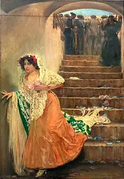 He had his first solo exhibition at the Sala Parés in 1903. Over the next few years, he had several showings at the Salon and, in 1906, was named a Knight in the Order of Alfonso XII, for his work depicting members of the Mossos d'Esquadra (Catalan police force) arresting a Romani couple. In 1908 his painting, "La Suegra" (The Mother-in-Law), was shown at the Salon and purchased by William Randolph Hearst. Two years later, he received a First Class prize at the National Exhibition for "The Wounded Torero".[1] Shortly after, his "Honeymoon in the Ansó Valley" was acquired by Archer Milton Huntington, for the Hispanic Society of America. He became a member of that society in 1914.