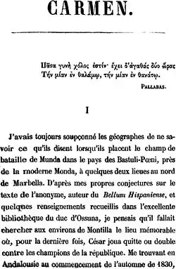 Carmen is a novella by Prosper Mérimée, written and first published in 1845. It has been adapted into a number of dramatic works, including the famous opera of the same name by Georges Bizet.[1]