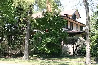 The Caroline Millward House is a historic house at 502 N. 5th Avenue in Maywood, Illinois. The house was built circa 1906 for owner Caroline Millward. It has an American Foursquare design, a simplified style popular in the early twentieth century, with Prairie School elements. The 2+12-story house has a typical Foursquare layout, with a rectangular shape, a front porch supported by wide piers, a glazed porch on one side, and a hip roof with a front-facing dormer. The horizontal emphasis of the design is typical of the Prairie School, as are its bands of windows, wood trim, overhanging eaves, and built-in furniture.[2]