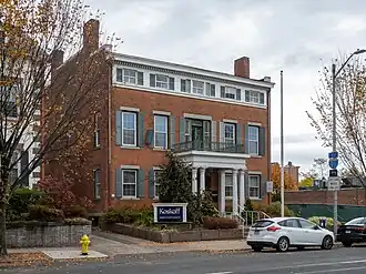 The Caroline Nicoll House is located in downtown New Haven, on the north side of Elm Street 1-1/2 blocks east of the New Haven Green. It is a 2+12-story brick structure, five bays wide, with stepped gable ends that include paired chimneys. The main entrance is sheltered by a portico supported by paired Egyptian-style columns. A two-story brick ell extends to the rear, further extended by a single-story addition. The interior retains many original features, including fireplace surrounds and trim, despite numerous alterations to adapt it for commercial use.[2]