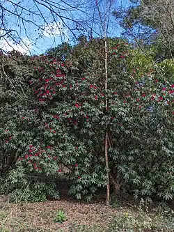 • Rhododendron falconeri - white flowering shrubs with large leaves characterised by rusty coloured woolly undersides, native to the mountains of North India. Emma Darwin mentioned the flowers of these specimen in her 1846 letter to Hooker: 'We have just received a blossom of Rhod Falconeri which has flowered in the open air at my brothers on Leith Hill Surrey'.[40][42]