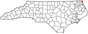 Carova Beach or Carova is an unincorporated community in Currituck County in the extreme northeastern corner of North Carolina, United States. The community, begun in the 1960s, is found on Currituck Banks, north of Bodie Island, and can be accessed only by boat or by four-wheel drive vehicle. There are no paved roads connecting Carova to the town of Corolla, North Carolina. The neighboring settlement of Sandbridge in Virginia Beach, Virginia, is not accessible by vehicle from Carova.