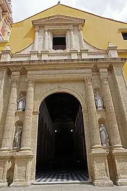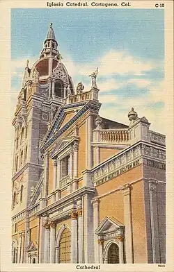 The current cathedral concerns the third building built as a cathedral church in the city. The first one was promoted by the Dominican friar Tomás de Toro y Cabrero, first bishop of Cartagena, and who was named by Pope Paul III. The construction of the temple began in 1535, only two years after the founding of the city, and ended in 1537.[4] It was a humble construction of "thatched roof and reeds", and was located in the block that is behind the present cathedral, with front on the street calle del Coliseo. The life of this building was short, for in 1552 a fire consumed much of the city and in ruins, the cathedral was converted.[4] In its replacement, between 1563 and 1568, the construction of the second cathedral temple was carried out, realized in wood and of thatched ceiling, because were difficult times and it did not have many resources, but was more solid than the previous one. From this second temple, a modest trace is preserved in the General Archive of the Indies and a physical remnant of its bulrush.[4]