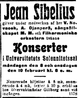 Newspaper advertisement (in Swedish) from Hufvudstadsbladet for the premieres of Jean Sibelius's Violin Concerto and Cassazione
