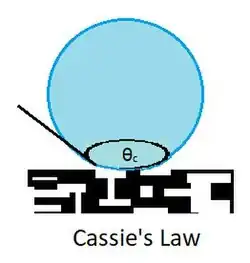 Cassie's law, or the Cassie equation, describes the effective contact angle θc for a liquid on a chemically heterogeneous surface, i.e. the surface of a composite material consisting of different chemistries, that is, non-uniform throughout.[1] Contact angles are important as they quantify a surface's wettability, the nature of solid-fluid intermolecular interactions.[2] Cassie's law is reserved for when a liquid completely covers both smooth and rough heterogeneous surfaces.[3]