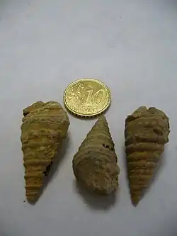 Three shells of Cassiope luxani, the coin is nearly 20 mm in diameter