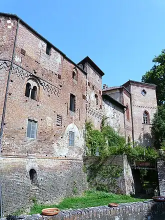 The Sannazzaro family, an Italian noble family originally from Lomellina, were granted the privileges to build the castle by Holy Roman Emperor Frederick I in 1163.[1] The emperor gave an imperial decree to four knights, Guido, Burgundio, Assalito, and Raineri de Santo Nazario, which permitted them to build castles on their lands.[2] The castle is located in Giarole, a small village in the Piedmont region. It was built between the 12th and 14th centuries. The original structure was modified multiple times in the 18th century.[2] In the 1850s, restoration took place on the north and west wings of the castle which added Neo-Gothic style, which was fashionable at that time.[2] Castello Sannazzaro spans 107,639 square feet and has forty-five rooms.[3] The grounds include a 269,097 square-foot garden.[3] The grounds of the castle also include a Catholic chapel dedicated to the Blessed Virgin Mary. The Statue of the Virgin of the Rosary, located in the chapel, is part of an annual celebration on the first Sunday of October, that includes a procession around the village, dating back to 1571.[2]