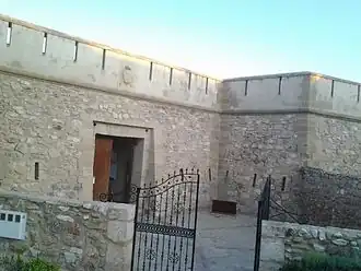 Castillo de las Escobetas ("Castle of the Nazarene") is located 3.25 miles (5.23 km) northward of Cantal Point,[1] in the town of Garrucha, Almería province, in the autonomous community of Andalusia, Spain. The fishing village of Garrucha suffered at the hands of Berber pirates until the year 1766 when barracks were built at Escobetas, a provisional military building which cost 13,970 reais. In 1769, the castle was completed at a cost of 181,000 reais. The fort was designed by the architect Francisco Ruiz Garrido. After its construction, Garrucha began to grow. It is of masonry construction in three section. The central portion is rectangular with rounded short sides. Attached to the right lateral side, there is a truncated pyramid shape with sloping walls. In its upper part, a parapet is pierced with loopholes. The main body is attached to the left side, of lower height, without openings. It is accessed by an external staircase and one tranche that attaches to the right side. In 1963, the Ministry of Culture declared the site a Bien de Interés Cultural monument.
