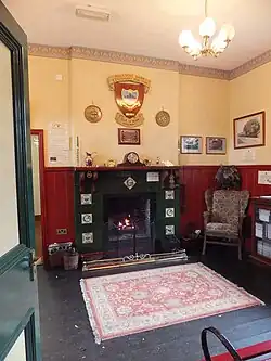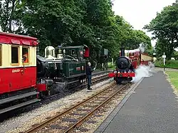 On the rear goods siding, one of the railway's three breakdown cranes was stored for a number of years, being removed in 1991 and subsequently restored and placed on display at Union Mills on the site of the former railway station. This crane was constructed in 1893 by the Birmingham-based firm Richard C. Gibbins. Inside the station's waiting room are several framed displays charting various historical aspects of the railway featuring old photographs, framed tickets, maps and other historical documentation relating to the earliest days of the railway. A headboard commemorating the centenary of the adjacent Poulsom Park in 1996 is also mounted on the wall above the fireplace, several other pieces of ephemera are available to view at the station. For many years, there also featured large advertisement hoardings lining the down platform but these were removed in 1974 having become unsafe. An original signal windlass constructed by the Birmingham company A.J. Linley & Co., was also displayed on the up platform for many years, a similar version is extant and used to operate the unique slotted post semaphore signal which protects the station's southerly side.
