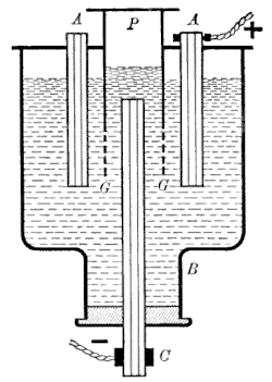 The diagram shows a ceramic crucible with a steel cylinder suspended within. Both cathode (C) and anode (A) are made of iron or nickel. The temperature is cooler at the bottom and hotter at the top so that the sodium hydroxide is solid in the neck (B) and liquid in the body of the vessel. Sodium metal forms at the cathode but is less dense than the fused sodium hydroxide electrolyte. Wire gauze (G) confines the sodium metal to accumulating at the top of the collection device (P).[3] The cathode reaction is