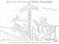 The mere possibility of the granting of a Statute of Autonomy for Catalonia provoked the immediate reaction of Spanish nationalism, which deployed a strong anti-Catalanist campaign based on clichés and stereotypes about Catalonia and the Catalans, but which managed to mobilize thousands of people who protested in Madrid and other cities.[15] The campaign was initiated by the so-called trust of the liberal press of Madrid formed by the newspapers El Liberal, El Heraldo de Madrid and El Imparcial, which was soon joined by the conservative daily ABC, the newspaper with the largest circulation in Spain. Various employers' organizations, some of them linked to the liberal sector headed by Santiago Alba, called for a large demonstration in Madrid, accompanied by the closure of stores, which brought together more than 100,000 people and had an enormous impact on public opinion —the newspaper El Imparcial headlined on its front page: "Madrid's protest against the separatism of the Catalans of the League"—. The campaign also included the boycott of Catalan products, as would happen in 1932 when the Cortes of the Second Spanish Republic debated the draft Statute of Autonomy of Catalonia.[24]