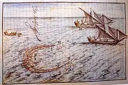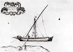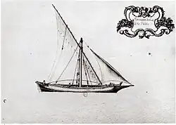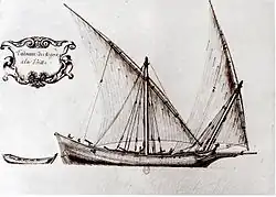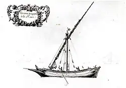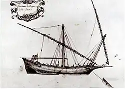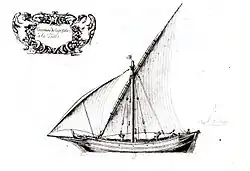 Towards the 16th century there is news of a single deck tartane with three small masts in Provence (France).[30] Regarding its military use, one of the first mentions of the tartane in the 17th century is found in the 1614 book, Pantero-Pantera "el Armata Navale", where there is an explanation of the maneuvers of the tartanes of the French navy.[31]