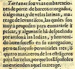José Veitia Linaje (1670) refers to the tartanes as levantisco tide, being used in navigation to the Indies. In the work Norte de la Contratación (Seville, 1672), he points out that: "Tartanes... of Latin sails, lifting of levantisks... but it is necessary to allow them 3 or 4 sailors from foreigners ("levantisks") for the sails, because the Spaniards do not understand their maneuver"..." (referring to the maneuver of the Latin sails). Veitia was the Official Judge of the Royal Audience of the Casa de Contratación de las Indias.[20][24] Reinforcing this fact, the Bulletin de la Société de géographie explains that "a 14-year-old boy practical of a Catalan tartane, at that age had already made the trip to Havana three times".[25]
