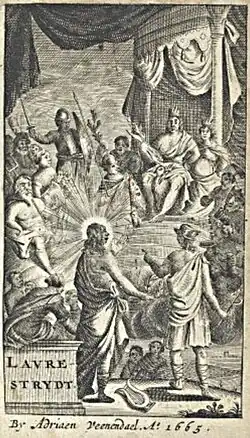 - C. Barlaeus, H. Beaumont, Francois Le Bleu, Cornelis Boey, Marcus Zuerius Boxhorn, Henrick Bruno, Jacob van der Burgh, Jacob Cats, Jeremias de Decker, George Rataller Doubleth, Daniel Heinsius, Nicholas Heinsius, PC Hooft, Daniel Mostart, H. Nierop, Catharina Questiers, Anna Maria van Schurman, Joost van den Vondel and Jacob Westerbaen, "Command, poems, etc. of the Corn Flowers (1658). In: Poems. Part 6: 1656-1661 (1896)[4]