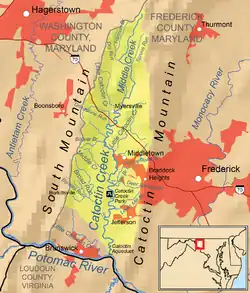 Catoctin Creek is a 27.9-mile-long (44.9 km)[1] tributary of the Potomac River in Frederick County, Maryland, US. Its source is formed north of Myersville. In Myersville, it merges with the Little Catoctin Creek at Doub's Meadow Park.[2] From there, it flows directly south through Middletown, and the southern Middletown Valley for the entire length of the stream collecting several smaller tributaries. It makes a crossing with the Chesapeake and Ohio Canal at the Catoctin Aqueduct, one of just 11 of these structures to survive.[2] Catoctin Creek enters the Potomac River east of Brunswick.