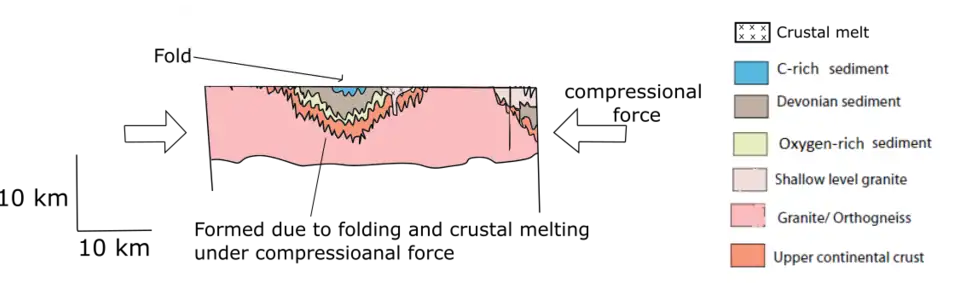 Figure 3 Cross section of part of the Tuva Mongolia Orocline. Adapted from Lehmann et al. 2010.[13] This cross section indicates that the rocks were folded under compressional force, and were partially melted due to friction, causing crustal melting, and thus the formation of the Tuva-Mongolia Orocline.[13]