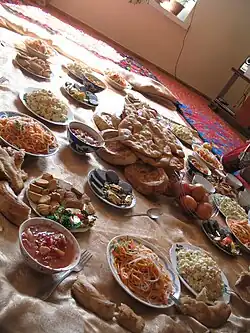 A meal typically begins with tea or fresh tandyr nan bread, followed by soup (shorpo) or pulled noodles (lagman). The main course is often a pilov dish with meat, rice and carrots; hundreds of variations of the basic pilov are possible with the addition of different herbs, dried fruits like raisins and apricots, nuts and other ingredients. After the main course a guest may be offered dumplings or grilled skewers of meat, and fresh fruit often takes the place of a final dessert course.[2] In many parts of Central Asia the meal is served on the floor with many plates laid out on a dastarkhan cloth.[1]