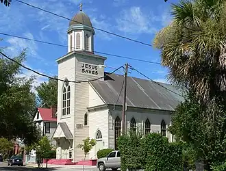 Central Baptist Church is a historic Southern Baptist church at 26 Radcliffe Street in Charleston, South Carolina.[2][3] The Central Baptist Church was completed in 1893 and is considered the first church in Charleston founded and constructed entirely by African-Americans. The structure reflects Carpenter Gothic and Italianate influences and remains in excellent condition. Perhaps the most significant features of the structure are the large folk-art murals portraying biblical scenes including the Crucifixion, the Ascension, and the Resurrection of Christ which date back to 1915. Architect, John Pearson Hutchinson Sr., was hired as a negro carpenter, building contractor, and non-licensed architect. He was also a Deacon of the church.[4] It was built in 1891 and added to the National Register in 1977.[1]