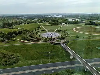 While still on the drawing board, planners noticed that the planned main streets in the proposed city centre would almost frame the rising sun on Midsummer's Day.[8][b] This story has become embellished over time and, according to subsequent reports, they consulted Greenwich Observatory to obtain the exact angle required at the latitude of CMK, and persuaded the engineers to shift the grid of roads a few degrees in response.[10][11] Physical reality does not match this report. From the highest point on Midsummer Boulevard, where the eastward horizon is unobstructed, the sunrise at 'first flash' is not aligned with the Boulevard.[12] In reality, the sun is somewhat elevated before alignment occurs, 40 minutes later.[13]