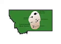 The central Montana Alkalic Province is located in the United States in central Montana. Montana is bordered by Idaho, Wyoming, North Dakota, South Dakota, and Canada to the north. Central Montana is unique when compared to the rest of the Rocky Mountains due to its east-west trend of tectonic features, including thrust fault zones, anticlines, and domes.[1] The area of tectonic activity experienced conditions of plastic deformation, which affected the whole region. The Montana Alkalic Province consist of Cretaceous intrusions of monzonite and syenite as well as Cambrian limestone, sandstone, and siltstone. Most of the sedimentary rocks are a result of deposition from a terrestrial fluvial environment.[2] Deposition included more than 13,000 feet of clastics that were later uplifted. The peak of this uplifting occurred during the Devonian. Deposition, uplift, and traps of carbonate shales have made central Montana prime for small-scale oil and gas production.[3] Other geologic formations in this area include Judith Mountains, Crazy Mountains, Highwood Mountains, and Bears Paw Mountains. These areas include various igneous formations including xenoliths, laccoliths, and veins. Each mountain exhibits similar but unique geologic features.