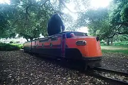 The miniature railway, running since May 10, 1948,[9] now runs an Arrow Development locomotive on 12-inch (30 cm) gauge track. The Arrow Streamliner locomotive was originally built in 1953 and later converted to battery power.[20] It replaced an Ottaway[21] steam locomotive from the founders of Joyland Amusement Park (Wichita, Kansas). It can accommodate 10 children.[9] Rides are $2 each. The train operator also occasionally opens the snack bar in the Fitzgerald Field grandstands. The miniature train is painted in the Southern Pacific "Daylight" livery.[9]