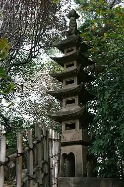 The Japanese Tea Garden was designed by Nagao Sakurai and was installed in 1966.[17][9] Plants featured in the garden include cherry trees, Japanese maples and bonsai.[17] San Mateo set up a sister-city relationship with Toyonaka in 1963,[18] and Toyonaka has donated several sculptures which can be seen in the Tea Garden, including the five-level stone pagoda statue (installed 1963) and a small shinden shrine (in 1991, for the Tea Garden's 25th anniversary).[19] In addition, the Japanese Tea Garden structures include the surrounding fence, a traditional gazebo (azumaya), and a teahouse (chashitsu).[17] The tea garden is open limited hours.