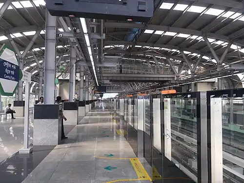 Central Park is an elevated metro station on the East-West corridor of the Green Line of Kolkata Metro, which is an eastern neighbourhood of Kolkata, West Bengal, India. The elevated structure is located above the 3rd Avenue between Central Park and Bikash Bhawan.[2] This station serves the Central Park and other government offices situated in Sector I, Salt Lake.