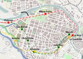 This change implied the closing of Parke/Guggenheim and Bilbao-La Naja stations, on the line that run beside the river before that date. This cleared ground for the creation of new riverside avenues and the tramway. The tracks used for the new branch were used before for freight transport, these tracks were covered and a new avenue and the park of Ametzola were created on top of them. The stations on the new branch are: