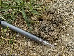 Within minutes of placing the final paralyzed beetle into its subterranean cell the adult wasp lays a single hotdog-shaped egg along the beetle's mesosternum. Prey beetles are paralyzed, not killed, ensuring that each beetle will remain fresh until the wasp larva can begin feeding upon it. After the egg is laid, the completed cell is detached from the burrow as the female wasp backfills the access with 3 – 6 cm of soil.