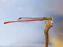 Its natural habitats are freshwater swamps, ponds and slow moving streams. The adult is a medium-sized damselfly (wingspan 50mm, length 45mm) mostly red with the synthorax becoming pale green as it matures. In Australia, the distribution is in suitable habitat in the north-west and north-eastern part of the continent from about Broome to the south-eastern Queensland border.[4] The taxon has been assessed as least concern 3.1 in the IUCN Red List.
