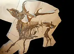 Cervus elaphus acoronatus was a red deer subspecies of large size, similar to that of the existing red deer, Cervus elaphus, with large and well-developed antlers.[1] In this archaic form, the antlers lack at their apices, even in adult individuals, the characteristic multipointed "crown" (hence the Latin name acoronatus, meaning without crown). In this subspecies, the antlers have a simple distal fork oriented transversally to the axis of the body.