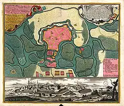 Around 1642–1643, the Cetate was reinforced under the direction of a captured German architect. Andrea Cornaro from Crete was tasked with renovating the fortifications and canalizing a branch of the Bega River.[10]
