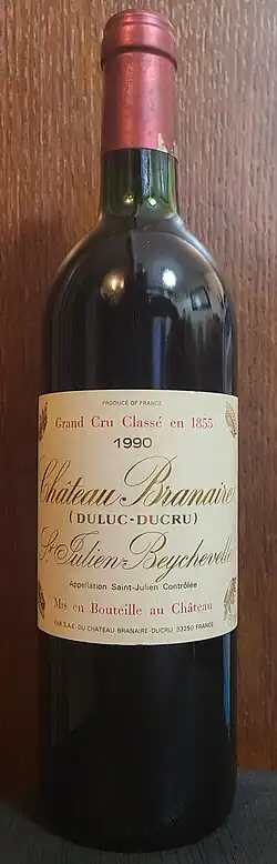 Château Branaire is a winery in the Saint-Julien appellation of the Bordeaux region of France. Château Branaire is also the name of the main red wine produced by this property and which was classified as one of the ten 'Fourth Growths' (Quatrièmes Crus) in the Bordeaux Wine Official Classification of 1855.