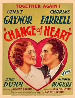 Change of Heart is a 1934 American pre-Code drama film starring Janet Gaynor, Charles Farrell, James Dunn, and Ginger Rogers. The movie, about a quartet of college chums who all move to 1934 New York City, was written by James Gleason and Sonya Levien from Kathleen Norris's novel, Manhattan Love Song and directed by John G. Blystone.