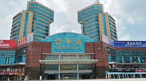 Changping railway station, formerly Sheung Ping railway station (at opening) and Dongguan railway station (until 2014), serves the city of Dongguan in Guangdong Province, China, located in Changping Town of the city. It is served by Guangshen railway, Guangmeishan railway, Jingjiu railway as well as the Guangdong through train service.