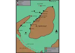 The only notable settlement is the hamlet of Chapel-le-Dale which is 4 miles (6.4 km) north-east of Ingleton, and 240 metres (800 ft) above sea level.[122][123] Farms exist on the upper northern side of the dale at Broadrake, Bruntscar, Gunner Fleet, Ivescar, and Winterscales.[124] There was a village at Southerscales on the northern flank of Ingleborough, but this has been recorded as a deserted medieval village.[125] The population of the dale in 1879 was given as 1,125, and after the 2011 Census, it was estimated to be 108.[126][127] St Leonards Church in the hamlet of Chapel-le-Dale was built in the late 17th century as a chapel of ease to the church in Ingleton. The actual date of its founding is uncertain, however a reader is mentioned in the parish records for Ingleton Fells (an early name for the Chapel-le-Dale area) in 1666.[128][25] In 1864, it was granted its own ecclesiastical parish.[129] The chapel is now a grade II listed structure.[130]