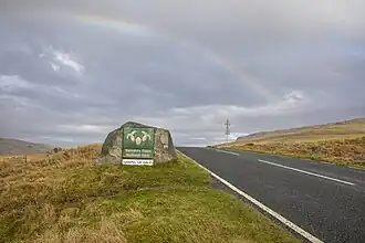 The head of the dale is at the viaduct of Ribblehead, with water flowing westwards as Winterscales Beck in the upper dale, and the flow of the River Ribble flowing southwards to form Ribblesdale.[85] Winterscales Beck drains Whernside and Blea Moor, but in times of normal flow, will disappear into the cave system below Chapel-le-Dale at Haws Gill Wheel, before re-appearing at God's Bridge, further down the valley beyond the hamlet of Chapel-le-Dale.[86][87] God's Bridge is a natural limestone bridge from which the sunken Chapel Beck emerges underneath to form the River Doe (or Twiss, or Greta); it was called God's Bridge as it was not fashioned by human hands.[88][89] In times of great rainfall and flood, the river does travel overground, around the chapel and emerges at God's Bridge, however, for the most part, this riverbed is dry.[90][91] John Self states that the river must be a torrent, as you can "stand in the dry [river]bed and see debris in the trees several metres above."[60] Water also enters the dale via the cave systems underneath the plateau of Scales Moor (SD719771) as Dale Barn Cave carries water from Kingsdale into Chapel-le-Dale.[92][79] The western end of the dale where the two rivers meet is just before the viaduct in Ingleton. This makes the dale unusual in having a railway viaduct at either end.[93] Also, the southern edge of the dale where it meets the edge of Ingleton is the boundary of the Yorkshire Dales National Park.[94]