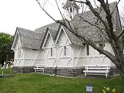 The Chapel was built of kauri and tōtara timber with a stone base.[1] It is cruciform in plan with "apsidal east and west ends," and has externally exposed timber framing with Thatcher later stopped deploying in his church designs.[1][3][4] It is the earliest surviving example of a Selwyn Church, which are notable for their "steeply pitched roofs, overhanging eaves, early English fenestration and carefully calculated proportions."[1]