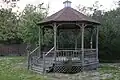 The interior is simple, with a single room adorned with beaded board wainscoting along the perimeter. Inside is a wrought iron fence from the balcony of the Hiram Thompson home.