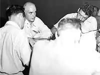![]() McVay talks to war correspondents in Guam about the sinking of his ship in August 1945 | |