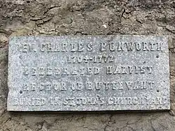 In 1995, a harp-shaped plaque was erected outside of Bunworth's former home in Buttevant and unveiled by Robert Warke, Bishop of Cork, Cloyne and Ross. An accompanying inscription reads: "Rev. Charles Bunworth, 1704 - 1772, Celebrated Harpist, Rector of Buttevant, Buried in St. John's Churchyard". Bunworth and his music were commemorated in a festival of local music held in Buttevant.[15]